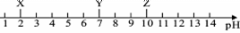 下圖X、Y、Z表示的是水、石灰水、稀鹽酸的近似pH。下列判斷錯(cuò)誤的是: