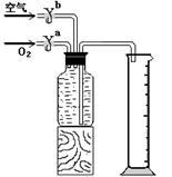 為了測(cè)定能使帶火星的木條復(fù)燃時(shí)氧氣的最低含量是多少,課外活動(dòng)小組的同學(xué)們進(jìn)行了實(shí)驗(yàn)探究。他們?cè)O(shè)計(jì)的實(shí)驗(yàn)方案是先將氧氣和空氣按不同的體積比收集在集氣瓶里。收集氣體的裝置如右圖。收集氣體的方法是:在100 mL集氣瓶里裝滿水,塞緊膠塞并關(guān)閉活塞b,打開活塞a通入氧氣,把瓶里的水排入量筒,當(dāng)量筒內(nèi)的水達(dá)到設(shè)定的體積后立即關(guān)閉活塞a,然后打開活塞b通入空氣,把瓶里的水全部排入量筒。若要收集一瓶含氧氣的體積分?jǐn)?shù)約為60%的氣體,則通入氧氣的體積和通入空氣的體積約是(提示:空氣中也有氧氣)·············· ( )