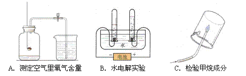 A、B、C都是研究物質(zhì)組成的實(shí)驗(yàn)。從研究方法得知,A實(shí)驗(yàn)是利用可燃物消耗瓶?jī)?nèi)的 ① ,使瓶?jī)?nèi)壓強(qiáng)減小來推測(cè)空氣里氧氣含量的。B實(shí)驗(yàn)是通過證明生成物的 ② 來推斷水的組成的。而C實(shí)驗(yàn)與 ③ (填實(shí)驗(yàn)代號(hào))實(shí)驗(yàn)的方法相同。
