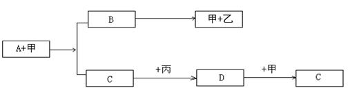 已知A、B、C、D是四種化合物,甲、乙、丙是三種單質(zhì):A是含碳化合物;A的相對分子質(zhì)量小于20,B是相對分子質(zhì)量最小的氧化物。在一定條件下,它們之間存在如下轉(zhuǎn)化關(guān)系: