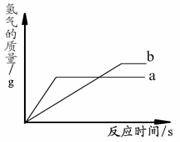 用質(zhì)量相等的鋅粉和鐵粉,分別與溶質(zhì)質(zhì)量分數(shù)相同且等質(zhì)量的稀鹽酸充分發(fā)生反應(yīng),產(chǎn)生氫氣的質(zhì)量與時間的關(guān)系如右圖所示。