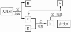 工業(yè)上以大理石和赤鐵礦為主要原料制取B和G,其轉(zhuǎn)化關(guān)系如下圖所示,已知D、G為單質(zhì)。