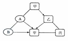 右圖中的物質(zhì)都是初中化學(xué)所學(xué)的,其中A、B為單質(zhì),B是可供動(dòng)植物呼吸的氣體;甲、乙、丙為化合物,甲與過量的丙、乙與過量的丙兩兩反應(yīng)的所有產(chǎn)物相同。圖中“—”表示兩端的物之間能發(fā)生化學(xué)反應(yīng);“→”表