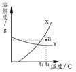 右圖為固體物質(zhì)X、Y的溶解度曲線。在溫度為t2℃時(shí)分別把質(zhì)量為a g的X、Y放入100 g水中,下表為對(duì)溶液狀態(tài)的判斷以及使不飽和溶液達(dá)到飽和采取的措施。其中正確的是 ( )