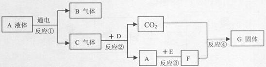 A、B、C、D、E、F、G是初中化學(xué)常見的物質(zhì),A在常溫下是一種無色液體,D是天然氣的主要成分,G是一種重要建筑材料的主要成分,E是一種金屬氧化物,與A反應(yīng)能生成一種常見的堿。它們之間的轉(zhuǎn)換關(guān)系如下圖所示: