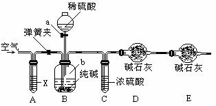 某純堿樣品中含有少量氯化鈉雜質(zhì),現(xiàn)用下圖所示裝置來(lái)測(cè)定純堿樣品中碳酸鈉的質(zhì)量分?jǐn)?shù)(鐵架臺(tái)、鐵夾等在圖中均已略去)。實(shí)驗(yàn)步驟如下:①按圖連接裝置,并檢查氣密性;②準(zhǔn)確稱得盛有堿石灰(固體氫氧化鈉和生石灰的混合物)的干燥管D的質(zhì)量為83.4g;③準(zhǔn)確稱得6g純堿樣品放入容器b中;④打開(kāi)分液漏斗a的旋塞,緩緩滴入稀硫酸,至不再產(chǎn)生氣泡為止;⑤打開(kāi)彈簧夾,往試管A中緩緩鼓入空氣數(shù)分鐘,然后稱得干燥管D的總質(zhì)量為85.6g。試回答: