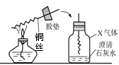 如圖將插入膠塞的一根光亮的紅色銅絲繞成螺旋狀,在酒精燈的火焰上燒一段時間后趁熱迅速伸入盛有石灰水和X氣體的集氣瓶中,塞緊膠塞,看到變黑色的銅絲又變?yōu)榧t色,同時石灰水變渾濁,則集氣瓶中的氣體X是