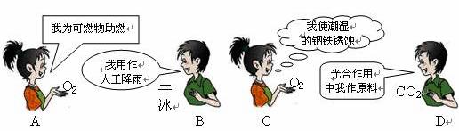 (1)屬于單質(zhì)的是 ,屬于氧化物的是 ,顏色為紫黑色的是 ,大理石的主要成分是 ,用于人工降雨的是 。