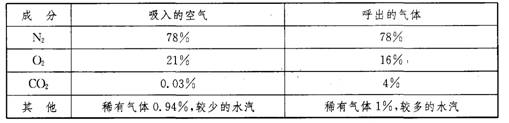 (2)人應(yīng)該是由________系統(tǒng)吸收氧氣。下表是人在呼吸時(shí)吸入空氣與呼出氣體成分的比較。平靜狀態(tài)下,如果一個(gè)人每次吸人與呼出時(shí)的氣體都是500 mL,氧氣的密度為1.4 g/L,根據(jù)表中信息,可求得呼吸1次人體可吸收氧氣________mg。因此呼吸1分鐘(16次)人體吸收的氧氣相當(dāng)于28瓶500 mL富氧水中的溶氧量。