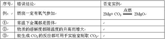 歸納總結(jié)是學(xué)習(xí)化學(xué)的一種重要方法,下面是小亮同學(xué)總結(jié)出的結(jié)論,請(qǐng)你舉出一個(gè)實(shí)例否定他的觀點(diǎn)(要求用化學(xué)式或化學(xué)方程式表示)。