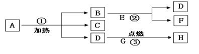A、B……H八種物質,有下圖所示關系:其中D能使帶火星的木條復燃,H是一種能使澄清石灰水變渾濁的氣體,在②的反應前后B的質量和化學性質都不改變。試推斷: