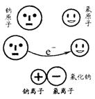 微粒模型觀察與比較。如左下圖所示,在鈉與氯氣的反應中,每個鈉原子失去1個電子,成為1個鈉離子;每個氯原子得到1個電子,成為1個氯離子;鈉離子與氯離子結合形成氯化鈉。因為1個電子的質量大約為1個質子或中子質量的
