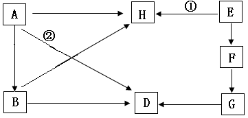 A——H是初中化學(xué)中常見的物質(zhì),A、D、G為單質(zhì),其余物質(zhì)均為化合物。其中D是一種紅色固體單質(zhì);E是一種有特殊氣味的液體,通過某反應(yīng)可同時(shí)生成H和F。