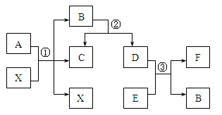 已知A、B、C、D、E、F為常見物質(zhì),其中A、B含有相同的元素,B、E為氧化物,C、D、F都為單質(zhì)。它們相互轉(zhuǎn)化的關(guān)系如右圖所示