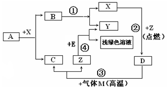 有關(guān)物質(zhì)的轉(zhuǎn)化關(guān)系如右圖所示,其中X、Y為兩種氣態(tài)單質(zhì),Z為固態(tài)單質(zhì);A為最簡單的有機(jī)化合物,B、C、D為三種狀態(tài)各不相同的氧化物(個(gè)別反應(yīng)的條件未注明);卮鹣铝袉栴}(已知高溫下CO和金屬氧化物反應(yīng)與CO和Fe2O3的反應(yīng)相類似):