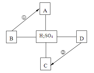 A~D是我們已經(jīng)學過的四種不同類別的常見物質(zhì),其中B是紅色固體, C固體在空氣中易潮解,A、B、C、D和H2SO4之間的相互關(guān)系如右圖所示( “→”表示物質(zhì)間的轉(zhuǎn)化關(guān)系, “——”表示物質(zhì)間可以相互反應(yīng)),請回答下列問題: