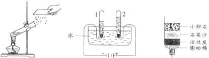 (1)下圖所示的3個實驗,A中水發(fā)生了______(填“物理”或“化學”)變化;B中試管2內(nèi)得到的氣體為________;C中凈化水的方法是______和吸附。