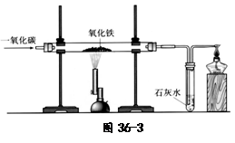 ⑷煉鐵的原理是利用一氧化碳與氧化鐵反應(yīng)。在實驗室里,可用圖36-3所示裝置進行實驗:實驗中玻璃管內(nèi)的粉末由紅色變?yōu)?nbsp; 色,該反應(yīng)的化學(xué)方程式為 ,通過實驗我可以得出的一氧化碳的相關(guān)化學(xué)性質(zhì)是