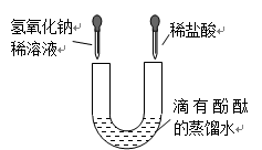 U形管中是滴有酚酞試液的蒸餾水,向左、右兩管中分別同時(shí)逐滴滴加一定量的氫氧化鈉稀溶液和稀鹽酸(如圖所示)。下列說法正確的是