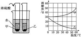 (3)燒杯中加入濃硫酸后,甲、乙兩試管中固體量的變化是 。除了加濃硫酸外,還可以加 物質,也會發(fā)生這樣的變化。