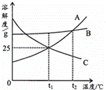 (1)t1℃時,A、B、C三種物質(zhì)中溶解度最大的是 ;
