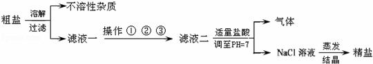 (1)操作中的物質(zhì)X為 ,正確的操作順序為 (填序號),為最終獲得精鹽,操作①、②和③后還需增加的操作是 ;