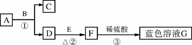 A~G均為初中化學(xué)中常見的物質(zhì)。其中A、C組成元素相同,E是紅色單質(zhì)。下圖是它們之間的轉(zhuǎn)化關(guān)系,請回答: