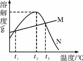 B.只有在t1 ℃時,M和N的溶解度才相等