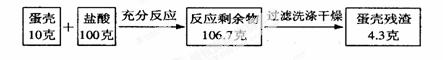(1)他倆將蛋殼洗凈、干燥并搗碎放在燒杯里,然后往燒杯中加入鹽酸,在蛋殼上很快就有許多小氣泡產(chǎn)生,將收集到的氣體通入澄清石灰水中,石灰水變渾濁。據(jù)此可判斷,收集到的氣體里含有 。