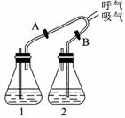 人通過(guò)肺與外界進(jìn)行氣體交換,吸入空氣中的氧氣,排出二氧化碳和水蒸氣。為了驗(yàn)證吸入的氣體與呼出的氣體有什么不同,采用了下圖裝置進(jìn)行實(shí)驗(yàn)。