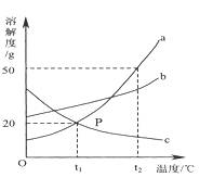 右圖是a、b、c三種物質(zhì)的溶解度曲線,a與c的溶解度曲線相交于P點。據(jù)圖回答: