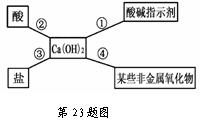 對知識的歸納和總結(jié)是學好科學的重要方法。在學習了堿的性質(zhì)后,小紅同學總結(jié)了氫氧化鈣的四條化學性質(zhì)(如圖),即氫氧化鈣與圖中四類物質(zhì)能夠