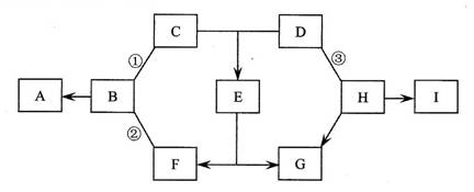 下圖中的A~I(xiàn)表示幾種初中化學(xué)常見的物質(zhì),其中A、D、I是氧化物,I中兩種元素質(zhì)量之比為3:4;B元素在地殼中的含量位居第三;C由三種元素組成;G為紫紅色。圖中“—— ”表示兩端的物質(zhì)間能發(fā)生化學(xué)反應(yīng);“ ”表示物質(zhì)間存在轉(zhuǎn)化關(guān)系;部分反應(yīng)物、生成物或反應(yīng)條件已略去。