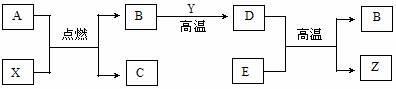 A、B、C、D、E、X、Y、Z都是初中化學(xué)中的常見物質(zhì),其中A是天然氣的主要成分,X、Y、Z是單質(zhì),B、C、D、E是氧化物,常溫下C是液體,Y是黑色固體,E是紅色粉末。它們之間有如下反應(yīng)關(guān)系: