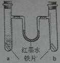 分別向a、b兩支試管中加入形狀和大小完全相同的鐵片,再向a中加入植物油,均塞上橡皮塞,U型玻璃管內(nèi)為紅墨水(開(kāi)始時(shí)兩端液面水平),如下圖所示,放置一段時(shí)間后,以下說(shuō)法錯(cuò)誤的是