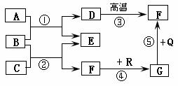 下圖是初中化學(xué)中常見(jiàn)物質(zhì)間的轉(zhuǎn)化關(guān)系,其中,在通常情況下,F(xiàn)、G是組成元素相同的兩種氣體,Q、R都是黑色固體(部分反應(yīng)條件和生成物已略去),試回答下列問(wèn)題: