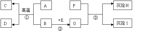互關(guān)系如下圖所示,(“→”指向生成物。)其中B是紅色粉末, A、C常溫下是氣體,H和I中含有一種相同元素,H不溶于稀硝酸。請(qǐng)回答下面問(wèn)題: