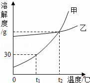 | B. | t1℃時(shí),50g水中最多溶解15g甲 |