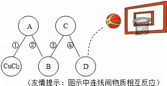 +物質(zhì)王國(guó)舉行一場(chǎng)趣味籃球賽.某對(duì)由鐵、二氧化碳、稀硫酸、氫氧化鈣、氯化銅五名“隊(duì)員”組成,比賽中,由氯化銅“隊(duì)員”發(fā)球,“隊(duì)員”間傳接球,最后由D位置“隊(duì)員”投籃進(jìn)球完成有效進(jìn)攻.傳接球“隊(duì)員”間物質(zhì)必須能相互反應(yīng),場(chǎng)上“隊(duì)員”位置及傳球路線如圖.(1)已知D位置上投籃的“隊(duì)員”是個(gè)滅火“能手”,則D位置“隊(duì)員”代表的物質(zhì)是 ;(2)B位置“隊(duì)員”所代表的物質(zhì)的一種用途是 ;(3)寫(xiě)出連線④代表的物質(zhì)間發(fā)生反應(yīng)的化學(xué)方程式 ,連線①代表的物質(zhì)間發(fā)生反應(yīng)的化學(xué)反應(yīng)的基本類型是 反應(yīng);(4)為實(shí)現(xiàn)“快速進(jìn)攻”.氯化銅除傳球給A位置“隊(duì)員”外,還能直接傳球給 “隊(duì)員”(填物質(zhì)名稱)