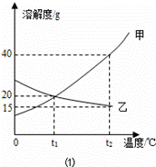 〔1〕溶解度隨溫度升高而增大的物質(zhì)是 (填“甲”或“乙”),t1℃時,甲的溶解度