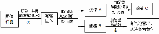 | (2)另取少量固體放于試管中,滴加足量的 . | 固體逐漸消失,有大量無色氣體產(chǎn)生,得到淺綠色溶液. | 固體中一定含有 ,一定不含F(xiàn)e2O3 |