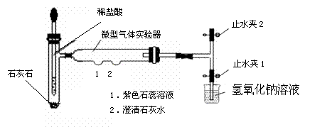 (1)關(guān)閉止水夾1,打開止水夾2,擠壓膠頭,滴入稀鹽酸,生成的二氧化碳在微型氣體實(shí)驗(yàn)器內(nèi)與1、2處的溶液反應(yīng)。1處紫色的石蕊溶液變成紅色,2處的反應(yīng)現(xiàn)象是 !
