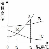 (2)將t2℃時A,B,C三種物質(zhì)的飽和溶液均降溫到t1℃時,溶質(zhì)質(zhì)量分數(shù)最小的是 .