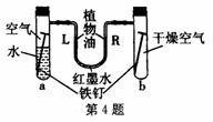 某同學(xué)設(shè)計(jì)了如圖所示的裝置探究鐵銹蝕的條件。a管中裝入少量煮沸的蒸餾水,b管中是干燥的空氣。調(diào)節(jié)L端與R端的液面高度一致,塞緊木塞,一周后觀察。下列推斷錯(cuò)誤的是 ( )