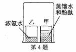 如圖所示,在燒杯甲中裝入蒸餾水,滴入2滴酚酞試劑,得到無色溶液。在燒杯乙中裝入濃氨水。用一只大燒杯把甲、乙罩在一起。幾分鐘后,發(fā)現(xiàn)甲中的溶液變成紅色。對上述現(xiàn)象的解釋正確的是 ( )