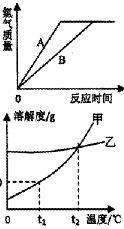 有等質量的A、B兩種金屬粉末,將A放入質量分數為15%的稀硫酸中,B放入質量分數為15%的稀鹽酸中,在生成物中A、B均為正二價,產生氫氣的質量隨反應時間變化的曲線如右圖。下列說法正確的是( )