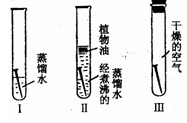 據(jù)估計,全世界每年因生銹損失的鋼鐵,約占世界年產(chǎn)量的四分之一,為探究鋼鐵銹蝕的原因,某探究性學(xué)習(xí)小組進行如右圖所示實驗:數(shù)天后,只有試管 (I) 中鐵釘在水面處生銹明顯。則下列結(jié)論錯誤的