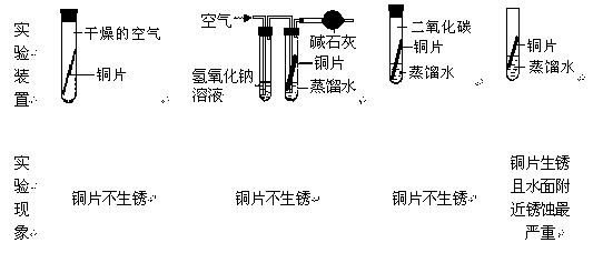 由實驗可知,銅生銹是銅與水、___________ 、____________ 等物質(zhì)共同作用的結(jié)果。反應(yīng)方程式為:______________________________________ 。
