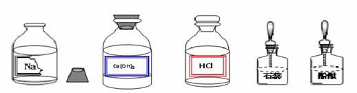 某校興趣小組同學(xué)準(zhǔn)備進(jìn)行常見(jiàn)酸、堿、鹽的性質(zhì)實(shí)驗(yàn)時(shí),發(fā)現(xiàn)實(shí)驗(yàn)臺(tái)上擺放的藥品中(如下圖),有一裝溶液的試劑瓶未蓋瓶蓋且標(biāo)簽破損,于是決定對(duì)這瓶溶液進(jìn)行實(shí)驗(yàn)探究:
