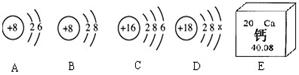 下圖中A、B、C、D是四種粒子的結(jié)構(gòu)示意圖,E是鈣元素在元素周期表中的信息.